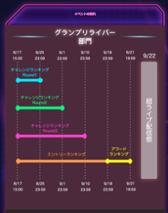 17LIVEにおいて、超ライブ配信祭とは、決まった期間(2021年なら8月17日~9月21日)の(グランプリライバー部門、最優秀男性ライバー部門、最優秀女性ライバー部門、タレント部門、シンガー部門など)でランキング上位にランクインしたライバーを表彰するお祭りイベントです。