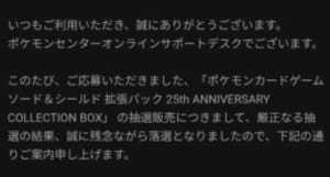 今回はポケモン25周年記念カードのBOX予約ということもあり、かなり競争率の高い抽選になった可能性が高いです。