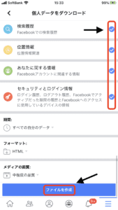 そこから、下にスクロールして、「あなたのFacebook情報」の「個人データのダウンロード」を選択し、