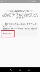 最後に「他のアプリの上に表示」を許可しなければ起動しないので、「権限を設定」をタップしてください。