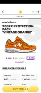 EARN RATEはそのスニーカーを履いて歩いて1000歩達成したときに貰えるAglet(通貨)です。