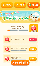 あつまれモルカー!PUI PUIパズルには、初心者・まいにち・ノーマルミッションの3種類があり、ミッションをクリアすることでルビーや各種便利アイテムが入手出来ます。