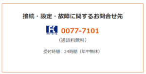 接続・設定・故障に関する電話お問合せ先(受付時間24時間)は「0077-7101」です。
