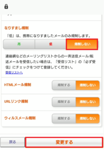 なおkりすまし規制のフィルターを「低」か「規制しない」にして、「変更する」をタップしてください。