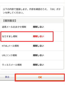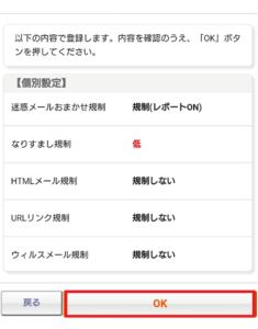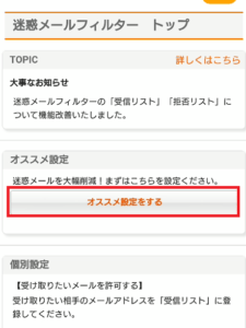 「オススメ設定」からは、なりすまし規制フィルターの状態を「高」にするしかできません。