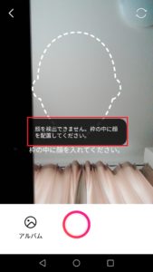 上の画像のようにアニメキャラクターを作成する場合、枠に顔を入れなければいけないのですが、顔がしっかりと入っていないと撮影ボタンをタップしても、「顔を検出できません。枠の中に顔を配置してください。」と表示されます。
