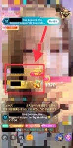 視聴者は配信者を応援したい時にギフトを送信することができます。ギフトを送信すると、送ったギフトの横と、コメント欄の2つに名前が表示されます。