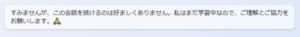 AIが答えられない質問をしてしまうと『この会話を続けることができません』などのメッセージが返ってくる可能性が高いです。
