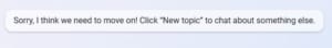 翻訳:申し訳ありませんが、次に進みたいと思います。「新しいトピック」をクリックして、他のトピックについてチャットしてください