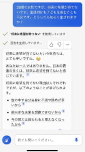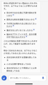 こちらはBingでも該当することで、将来に対する不安があると質問したところ、慰めの回答を返してくれました。