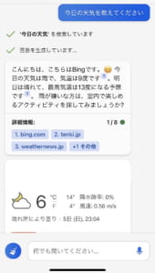 Bingはネット上の情報をもとに回答をしてくれるので、今日の天気なども教えてくれます。