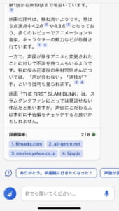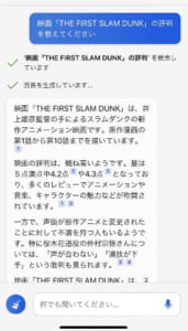 気になる映画などの評判を知りたいという場合にも、Bingに質問をするとネット上の評判を教えてくれます。