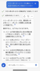 今回の例では「ハリーポッターシリーズを要約して、結末までのあらすじを教えてください」と質問をしてみました。