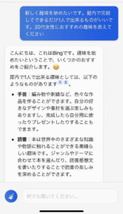 Bingでは、おすすめの趣味などの答えが曖昧なものについても答えてくれます。