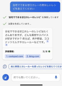 カレーのレシピについて質問する際にも、ざっくりとした質問の場合にはより具体的な質問をするように促されます。