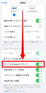 Cookieは、設定アプリからオンにできます。設定を開いたら、画面を下へスクロールしてSafariをタップします。Safariのメニュー画面が開かれますので、画面を下へスクロールし、すべてのCookieをブロックの項を確認します。こちらがオンになっていると、Cookieが使えない状態にあります。