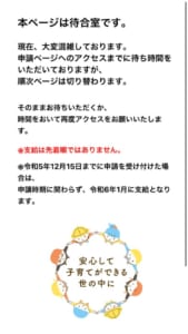 現在アクセスが集中しています。申請は先着順ではありませんので、時間を置いて試しましょう。特に深夜はスムーズです。