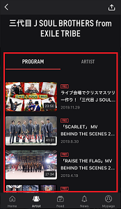 PROGRAMの項目にグループが出演した動画のアーカイブが表示されます。