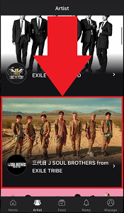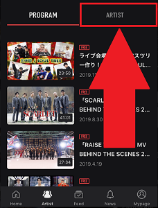 アーティストが出演している動画を絞り込む場合にはグループの項目からARTISTタブを選んでタップします。