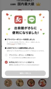 出前館のサイトを開くと、現在プライバシーポリシーへの同意とLINEアカウントとの連携への同意を求めるポップアップが表示されています。