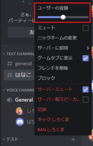 他にもボイスチャンネルで複数人と通話しているときに特定の人の名前上で右クリックを行うとメニューが表示されます。