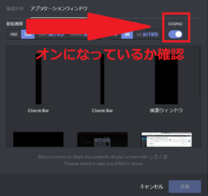 すると、上のような画面共有の設定が表示されるので「SOUND」がオンになっているか確認してください。