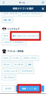 カテゴリのヘッドウェア⇒帽子・カチューシャ・ファンキャップをタップします。さらに検索をタップしましょう。