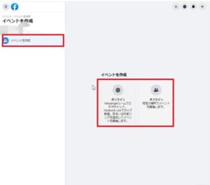 イベントを作成を選択して、オフラインイベントを作成したいときはオフライン、オンラインイベントを作成したいときはオンラインを選択しましょう。
