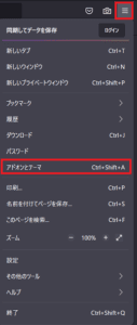 Firefoxを起動させ、右上の三をクリックして、アドオンとテーマをクリックします。