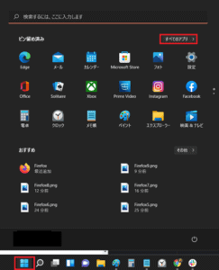 まず、パソコンのWindowsマークをクリックします。次に右上のすべてのアプリをクリックします。