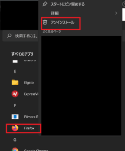 アプリの中からFirefoxを探し出し、右クリックします。メニューが表示されたら、アンインストールをクリックします。