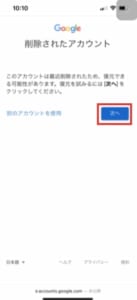 削除されたアカウントというページが表示されるので、内容を確認して次へをタップします。