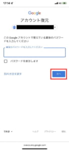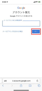削除したGoogleアカウントを復元したい場合には、アカウントの復元を開いて復元したいメールアドレスを入力し、次へをタップします。