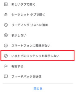 いまトピのコンテンツ全体をGoogle Discoverから消すには、いまトピの記事の横にある・・・を選択しいまトピのコンテンツを表示しないを押すようにしましょう。