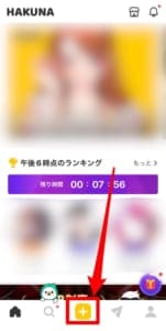 HAKUNAには、録画機能が存在します。機能を使う為には、まずは配信を行いましょう。配信を行う画面はホーム画面の下にあるプラスをタップする事で開けます。