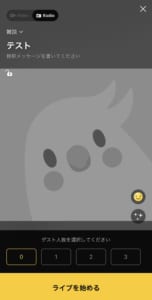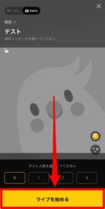 1つ前の画面に戻りますので、画面下にあるゲスト人数の中から該当するものをタップします。ゲスト人数選択画面の下にあるライブを始めるをタップすれば、配信がスタートします。
