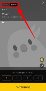 配信行うには、まずどのような配信を行うか決める必要があります。画面左上にあるVideoRadioのどちらかをタップし、ライブ配信を行うのかラジオ配信を行うのか選択しましょう。ライブの場合はVideoを、ラジオの場合はRadioをタップします。