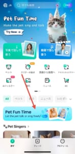 まずPet Fan Timeをタップしましょう。(最初にお試し体験や有料課金が表示されますが、それは×で飛ばして下さい)