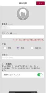 登録ページでは、登録したいメールアドレスとパスワードを入力してアカウントの作成をタップし、必要事項を入力したら次へを押せばOKです。
