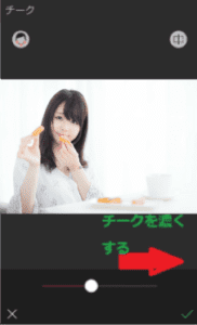 頬にチークを入れたいときは、チークアイコンを選択して、バーで色味を調整すればOKです。