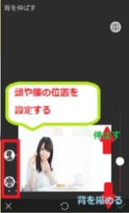 背を伸ばすを選択して、腰や頭の位置を設定したら(デフォルトで設定されます)、上にスワイプすることで身長を伸ばす加工ができます。