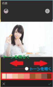 色味補正をかけたいときは、色味アイコンを選択して色をタップし、バーでトーンを調整していけばOKです。