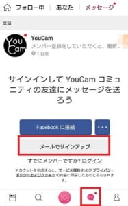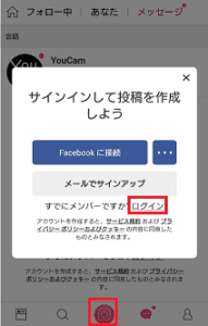 YouCam Perfectを起動している状態でログインしたいときは、メッセージアイコンをタップしログインを押します。