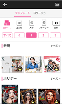 コラージュ機能を使うには、まずコラージュを選択してテンプレートやコラージュから使いたいものを探してください。