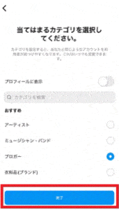 アカウントのカテゴリを選択し、次へをタップします。カテゴリはなんでもよいです。今回は「ブロガー」にしました。