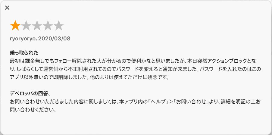 Instaチェッカーではログイン時にインスタのログイン情報が求められます。Instaチェッカーの利用規約にはログイン情報の不正な利用はしないと書かれていますがアプリのレビュー欄には不正アクセスが頻発したという口コミがいくつも見られます。