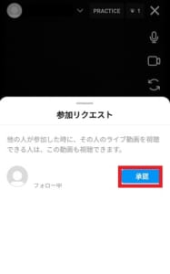 練習の配信画面に参加できます。練習のライブ配信でコラボしたい場合は、参加をリクエストをタップします。