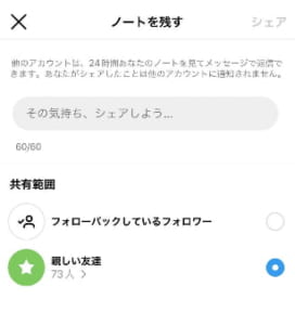 ノートの公開範囲はストーリーと同じように「親しい友達」を選ぶことができます。