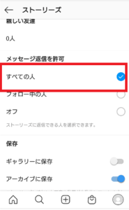 クイックリアクションをフォロー状態でない人も含むすべての人から受け付けたいときは、「メッセージ送信を許可」の項目にあるすべての人をタップし有効状態にすればOKです。