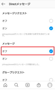 通知を受け取りたくないときは左のように、「メッセージ」の項目にあるオフをタップしチェックが付けばOKです。